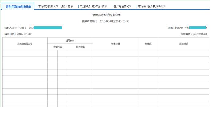 (3)申報表分為“酒類消費(fèi)稅納稅申報表”“本期準(zhǔn)予抵減(扣)稅額計算表”“本期代收代繳稅額計算表”“生產(chǎn)經(jīng)營情況表”“本期減(免)稅額明細(xì)表”五個部分。