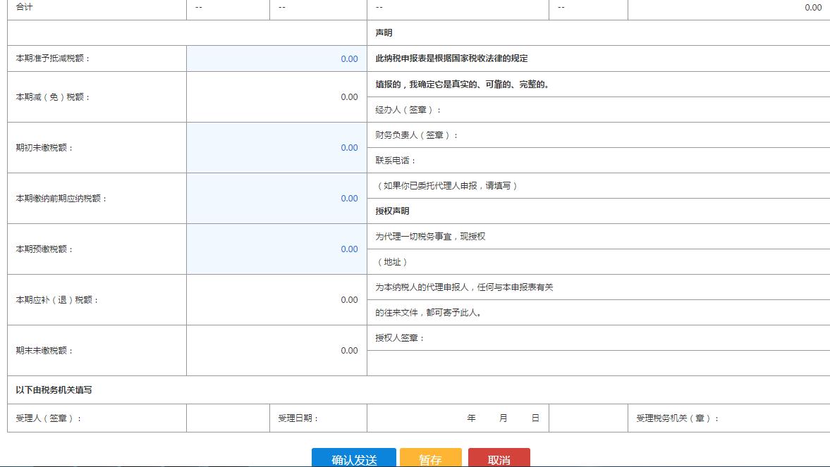 手動填入本期準(zhǔn)予抵扣稅額、期初未繳稅額,本期繳納前期應(yīng)納稅額、本期預(yù)繳稅額,本期應(yīng)補(bǔ)(退)稅額和本期減(免)稅額自動計算出。