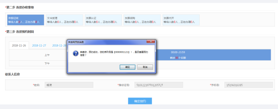 (2).選擇辦稅事項(xiàng)、辦稅時(shí)間,確認(rèn)聯(lián)系人,并“確定預(yù)約”。