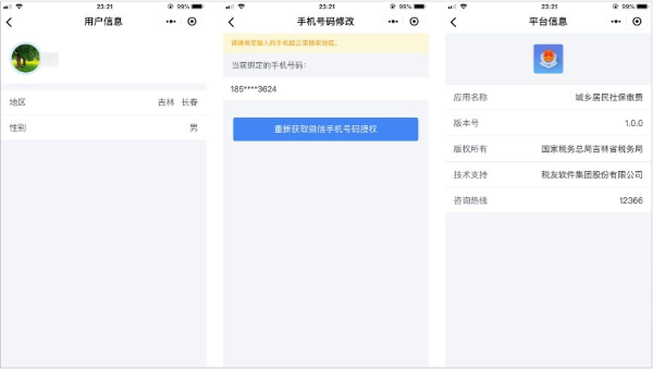 點擊小程序頁面右下角“我的”按鈕,個人信息查詢,綁定手機號變更,程序版本和咨詢熱線查詢: