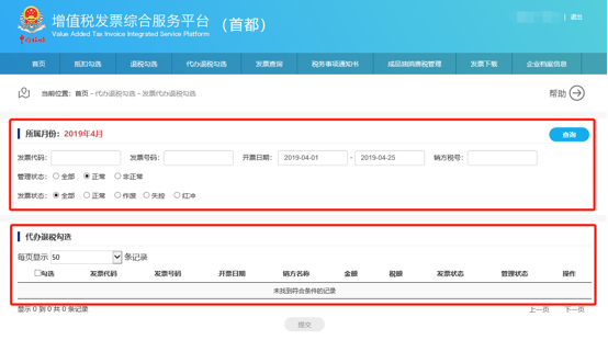 在此功能中分為上、下兩個區(qū)域,即查詢條件區(qū)域和發(fā)票查詢結(jié)果勾選操作區(qū)域。