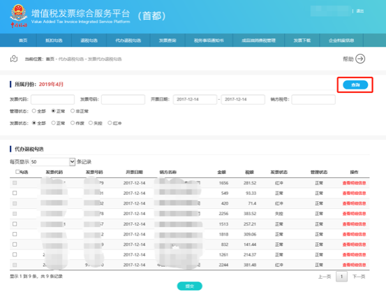 默認查詢確認狀態(tài)為“正常”的發(fā)票。 |