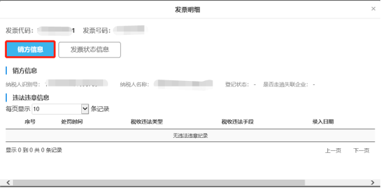 (2)銷方信息頁面包括該發(fā)票的銷方信息和違法違章信息,如下圖: