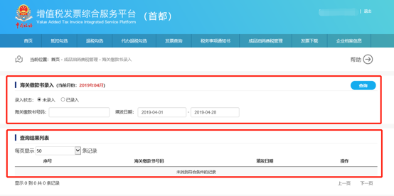 默認(rèn)為空,如果要精確查詢(xún)單張海關(guān)繳款書(shū)功能,則輸入22位字符:含數(shù)字字母/-的4類(lèi)型內(nèi)容即可 |