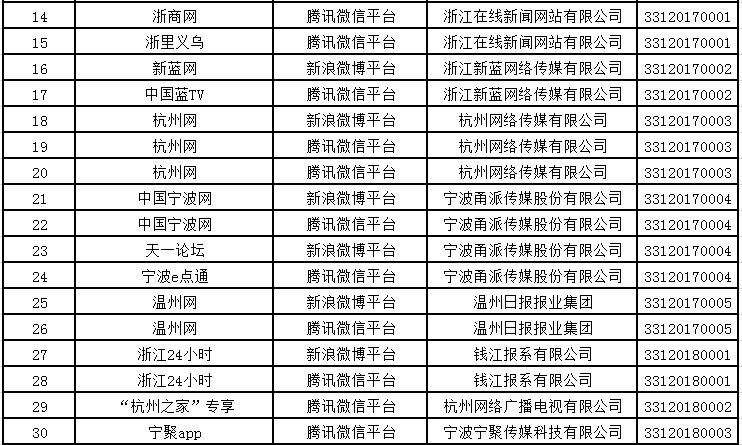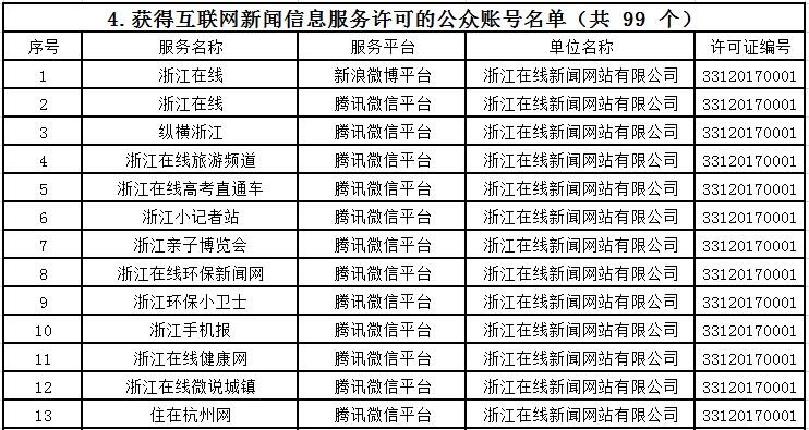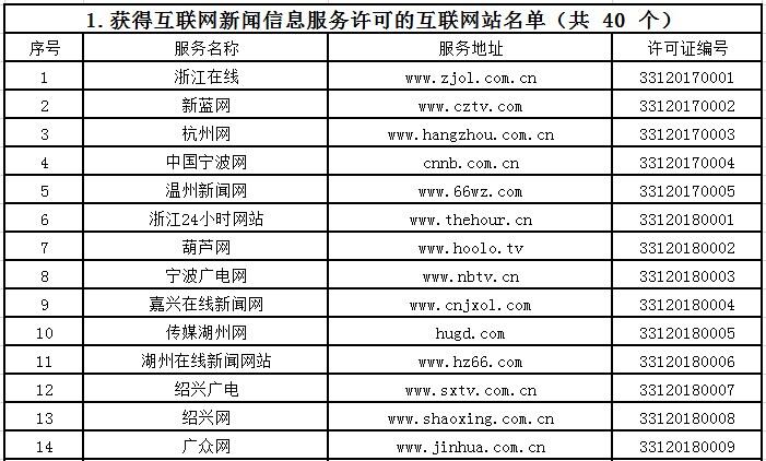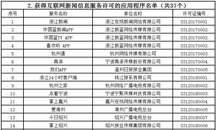 截至目前,浙江共有獲得互聯(lián)網(wǎng)新聞信息服務(wù)許可的單位36家,具體服務(wù)形式為:互聯(lián)網(wǎng)站40個,應(yīng)用程序37個,論壇5個,公眾賬號99個。