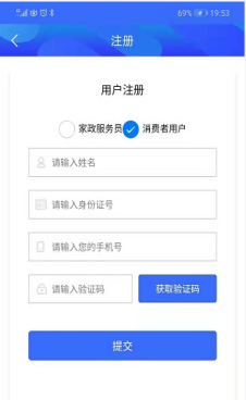 未注冊用戶可選擇家政服務員用戶進行注冊。注冊時需填寫姓名、身份證號、手機號并通過短信驗證。點提交: