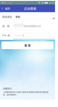 執(zhí)照下載成功之后,點(diǎn)擊登錄按鈕,選擇企業(yè)登錄,輸入默認(rèn)PIN碼123456,如下圖1-10,1-11
