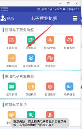 (15)關(guān)于下載電子營業(yè)執(zhí)照失敗,安全模塊下載電子營業(yè)執(zhí)照失?。合螺d執(zhí)照失敗,失敗原因:企業(yè)信息不存在