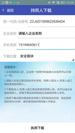 2、輸入統(tǒng)一信用代碼/注冊號,或者企業(yè)名稱,錄入聯(lián)絡(luò)人手機號(法定代表人的手機號),選擇下載位置“安全模塊”,點擊“執(zhí)照下載”