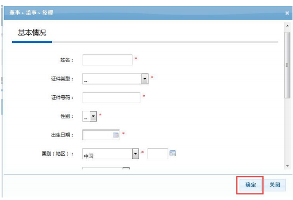 在“董事、監(jiān)事、經(jīng)理”標簽頁中,點擊【+添加人員】按鈕進入高管人員填寫頁面,分別填寫法定代表人及其他高管人員的基本信息、任職情況信息等,然后點擊【確定】按鈕將信息提交。如下圖。