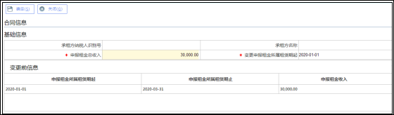 在彈出的界面中,將“變更申報租金所屬租賃起”修改為“2020-04-01”后,點擊左上方【確定】。如下圖所示: