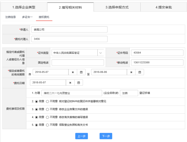 進(jìn)入注銷信息填寫頁面,如圖4-3所示。用戶填寫注銷信息頁面,填寫完成點擊頁面底部下一步按鈕,進(jìn)入授權(quán)委托頁面。