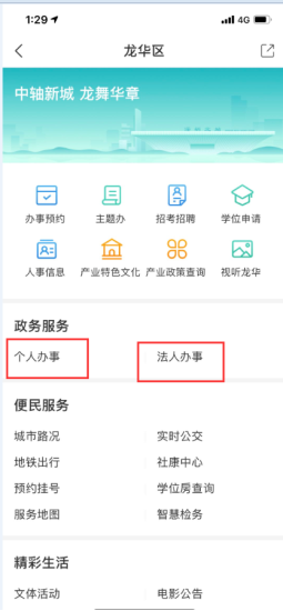 三、在區(qū)級服務中找到龍華區(qū),點擊進入, 可看到個人辦事和法人辦事兩大模塊: