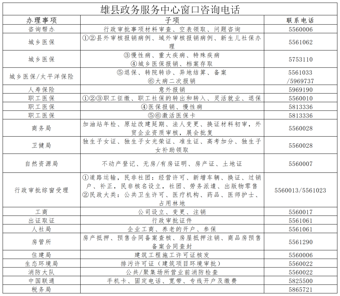 雄縣政務服務大廳各窗口聯(lián)系電話: