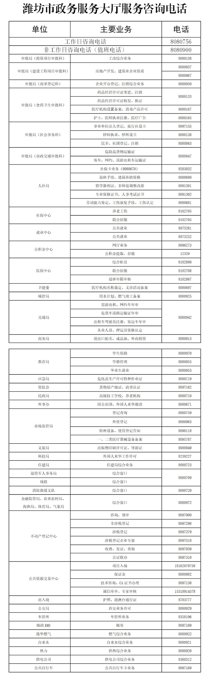 濰坊市各(區(qū))縣政務(wù)服務(wù)中心辦事大廳入駐單位窗口咨詢電話