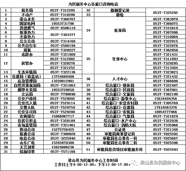 | 梁山縣行政審批服務局 | 0537-7025580 |