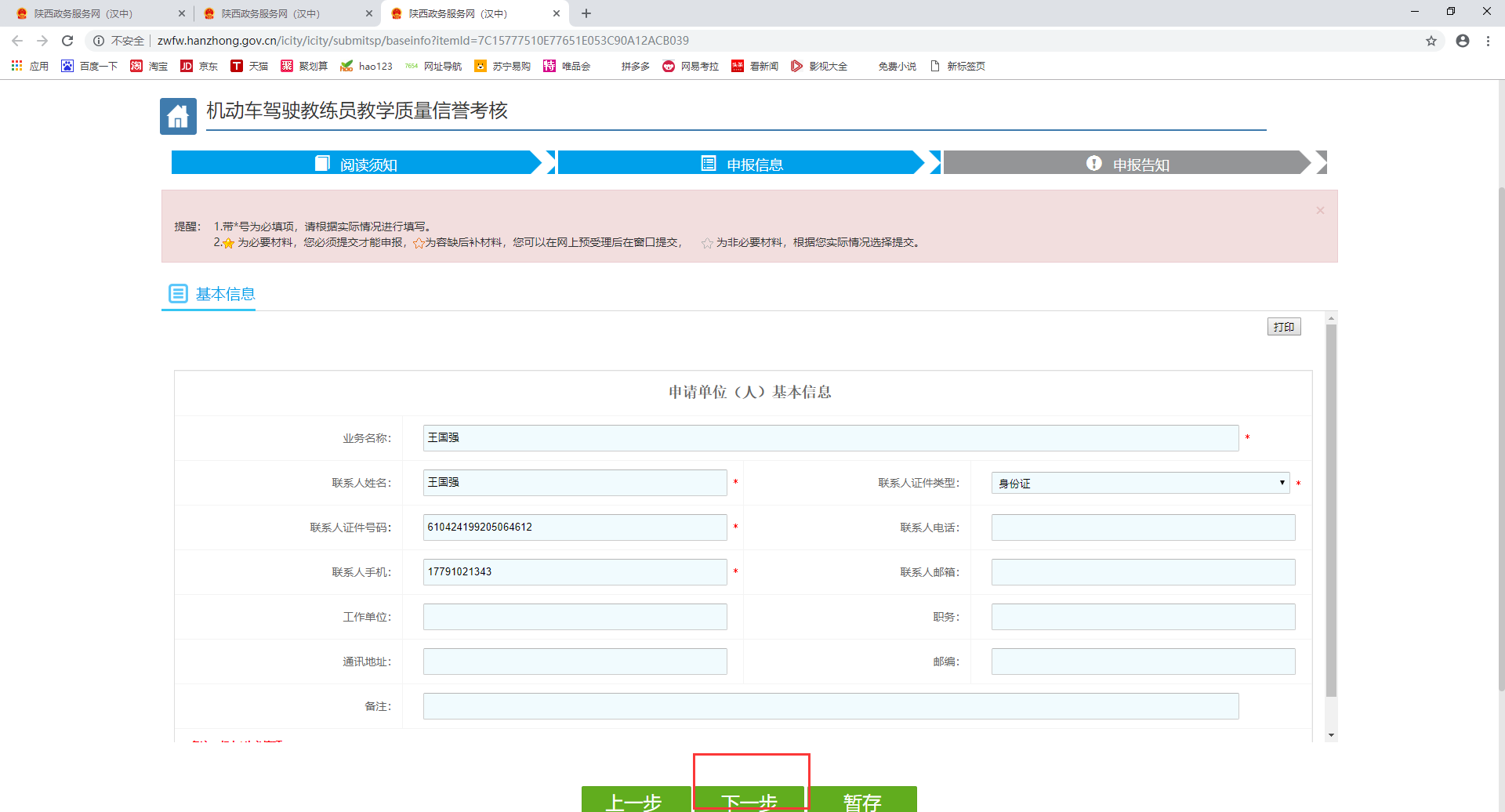 9.申報(bào)信息,填寫基本信息(注冊賬號時填寫的信息會自動填充),如需修改,可直接進(jìn)行修改,填寫完畢點(diǎn)擊下一步。注意:帶*為必填項(xiàng)。