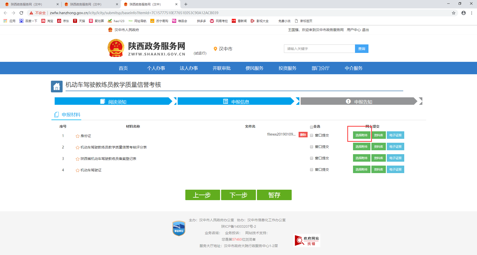11.上傳申報(bào)材料,帶*的材料為必要材料,材料可以點(diǎn)擊“選擇附件”從本地上傳,也可點(diǎn)擊“資料庫”選擇當(dāng)前賬戶之前上傳過的電子材料,還可從“電子證照”中選擇漢中服務(wù)網(wǎng)申報(bào)產(chǎn)生的證照信息。