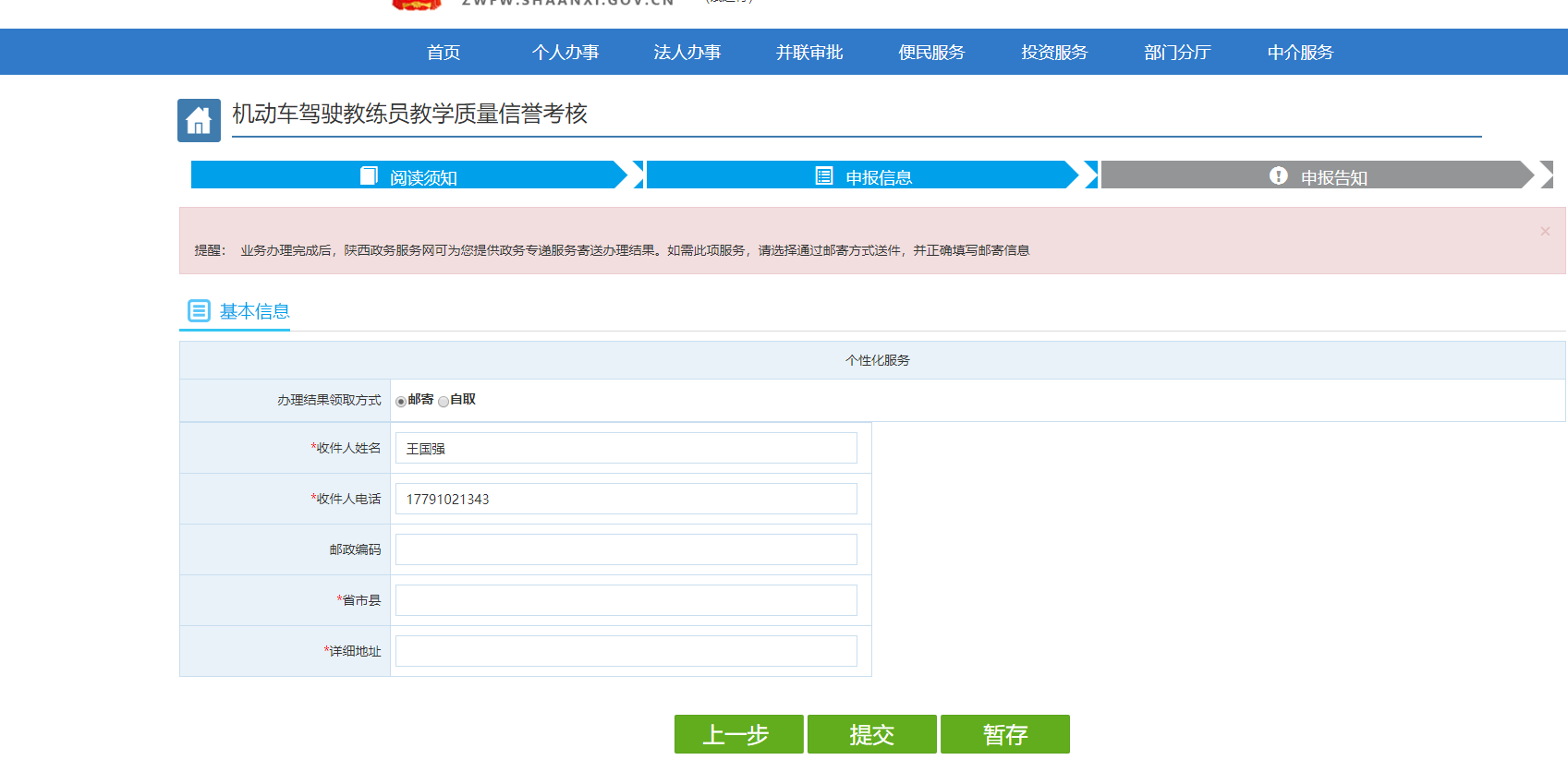 12.申報(bào)信息,選擇結(jié)果領(lǐng)取方式,可以選擇自取或郵寄,如果選擇郵寄則需填寫郵寄地址。