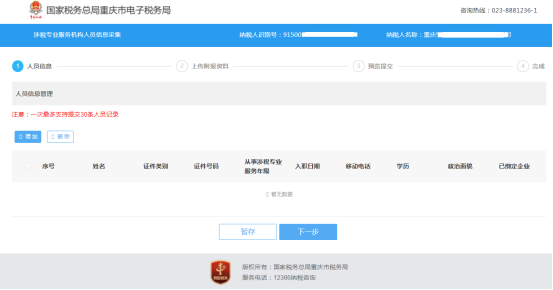 第三步:點(diǎn)擊“新增”,彈出涉稅人員錄入信息框,依次錄入涉稅人員實(shí)名信息、涉稅專業(yè)資格證書信息。填寫無誤,點(diǎn)擊“保存”,然后選中錄入的人員信息記錄,點(diǎn)擊“下一步”(如有多條人員記錄,可以選中多條記錄,最多不超過30條)