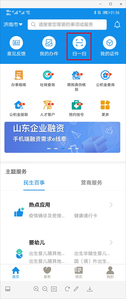 點(diǎn)擊“立即認(rèn)證”后,頁(yè)面出現(xiàn)二維碼信息(圖2)。請(qǐng)使用愛(ài)山東APP首頁(yè)掃一掃功能進(jìn)行臉認(rèn)證(圖3)。手機(jī)上沒(méi)有安裝“愛(ài)山東”APP,可以點(diǎn)擊(圖2)中藍(lán)色字體部分“愛(ài)山東APP”會(huì)彈出二維碼,掃描二維碼下載APP。