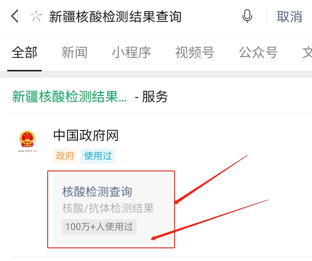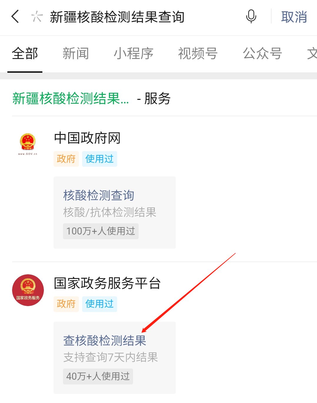 使用微信搜索“新疆核酸檢測結(jié)果查詢”,點(diǎn)擊進(jìn)入中國政務(wù)網(wǎng)下面的“核酸檢測查詢”,或直接點(diǎn)擊識別下方二維碼進(jìn)入小程序;
