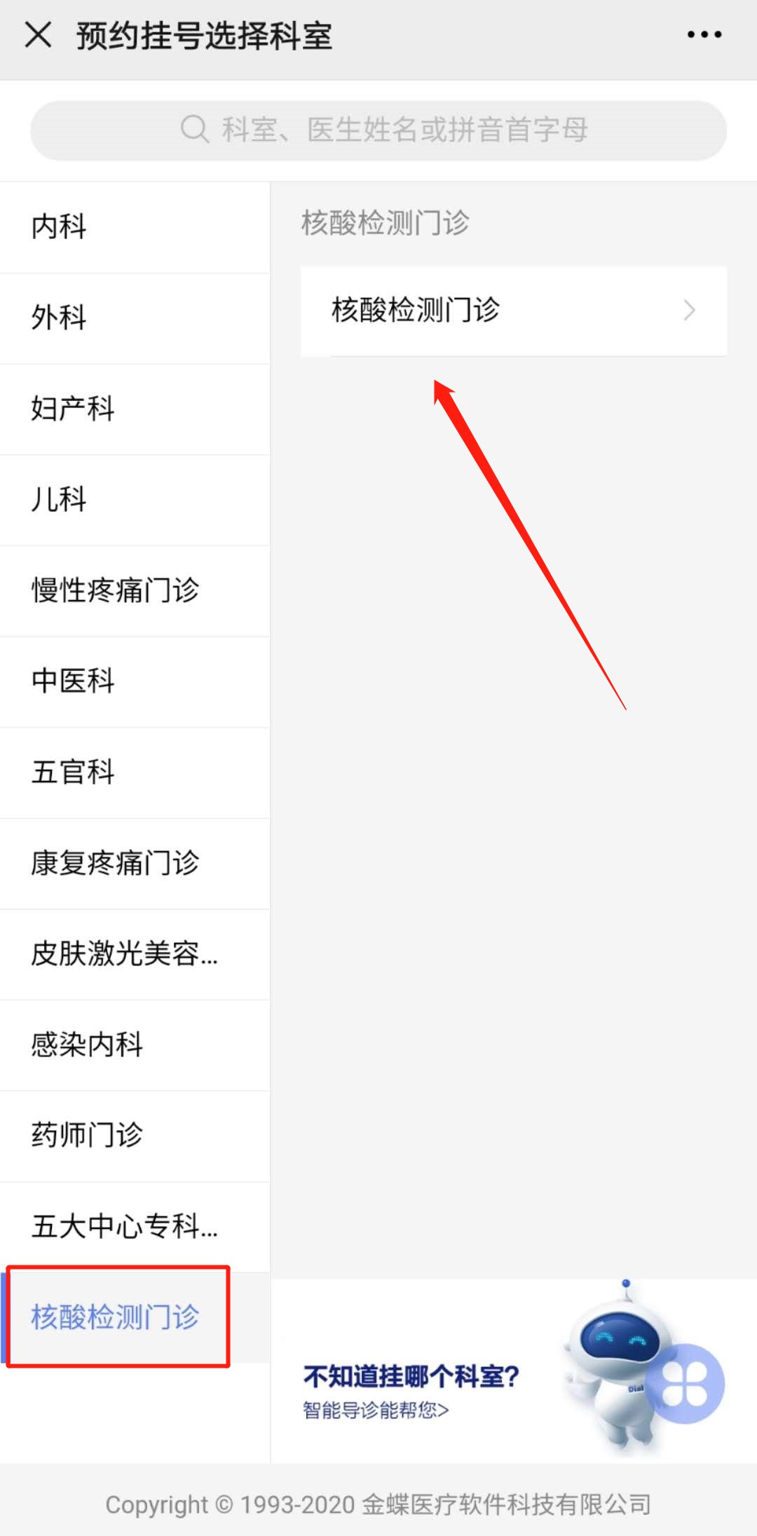 預(yù)約流程:關(guān)注公眾號(hào)——預(yù)約掛號(hào)——找到核酸檢測(cè)門診——點(diǎn)擊掛號(hào)