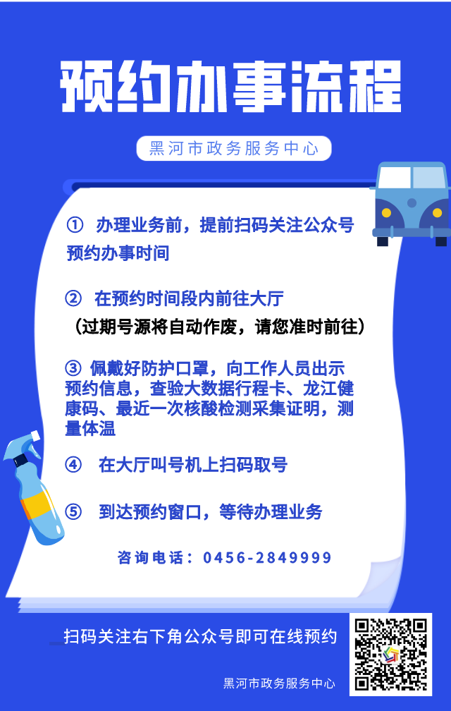 鑒于目前疫情實際和防控要求,為減少線下辦事人員聚集給您帶來的風(fēng)險,建議大家改變辦事習(xí)慣,更多通過網(wǎng)上“非接觸”方式辦理政務(wù)事項,盡量減少到辦事大廳現(xiàn)場辦理業(yè)務(wù)。黑河市政務(wù)服務(wù)大廳實行“預(yù)約辦”和“網(wǎng)上辦”等方式的政務(wù)服務(wù),工作時間:上午9:00-11:30、下午13:30-15:00,凡進(jìn)入政務(wù)服務(wù)大廳者,均要積極配合工作人員開展必要的體溫檢測、查驗“龍江健康碼”和“通信大數(shù)據(jù)行程卡”等工作。為了節(jié)省時間、避免聚集,請您下載行程卡并完成注冊,減少在大廳停留時間。