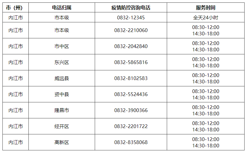 內(nèi)江市新冠疫情防控指揮部咨詢電話:0832-2210060;