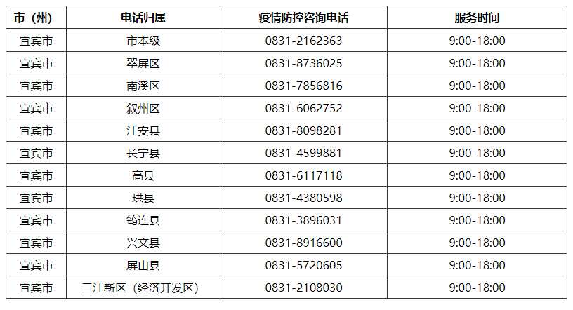 宜賓市各(區(qū))縣、市新冠疫情防控指揮部咨詢電話