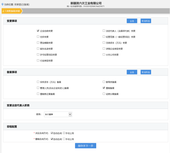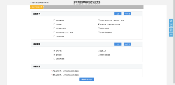 4. 進入變更登記頁面,選擇變更事項和備案事項,如下圖所示。