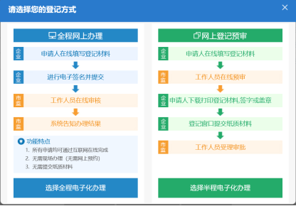 1. 根據(jù)業(yè)務情況上傳所有資料,所有資料上傳完成后點擊【保存并預覽】。系統(tǒng)彈出如下選擇項。這里選擇全程電子化辦理。