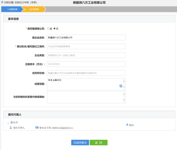 9. 錄入名稱申報信息,錄入完成后如下圖所示。注:操作方法參考“企業(yè)名稱自主申報”部分。