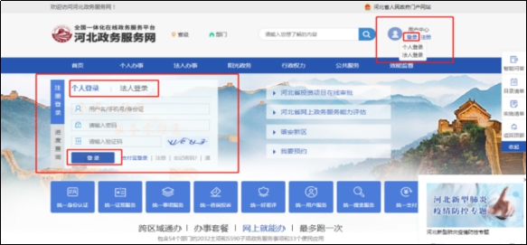 (1)進(jìn)入河北政務(wù)服務(wù)網(wǎng)首頁,網(wǎng)址:(http://www.hbzwfw.gov.cn/),或百度搜索“河北政務(wù)服務(wù)網(wǎng)”。首頁右上角“用戶中心”或者頁面左上部,點(diǎn)擊“登錄”按鈕,根據(jù)法人或個(gè)人選擇登錄類型,輸入用戶名、密碼以及驗(yàn)證碼,點(diǎn)擊“立即登錄”。若無賬號(hào),請先注冊賬號(hào)(注:不動(dòng)產(chǎn)登記網(wǎng)上申請的登錄用戶須為實(shí)名認(rèn)證用戶)。
