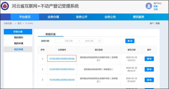 選擇【我的草稿】,點(diǎn)擊【業(yè)務(wù)編號(hào)】,對登記申請材料及信息進(jìn)行更正或補(bǔ)充,申請信息更正補(bǔ)充完畢后重新提交。