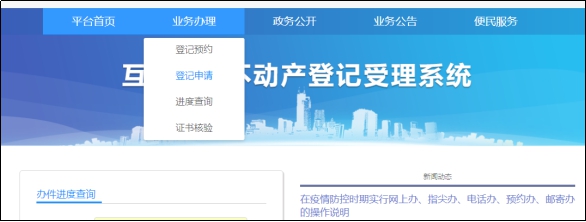 (1)登記申請。在“互聯(lián)網(wǎng)+不動(dòng)產(chǎn)登記”受理系統(tǒng)的業(yè)務(wù)辦理中選擇登記申請。