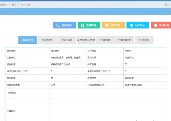 (2)查看指南。找到所申報(bào)事項(xiàng)后,可先點(diǎn)擊【辦事指南】,了解辦理該事項(xiàng)需要的申報(bào)條件、申請材料、辦理流程等信息,還可撥打各縣(市、區(qū))登記部門咨詢電話進(jìn)行業(yè)務(wù)咨詢。