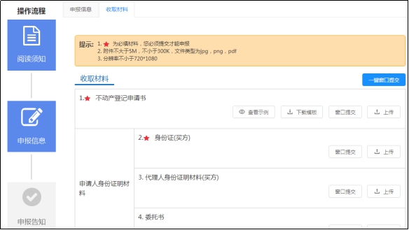 (5)上傳材料。申請材料支持窗口提交、上傳電子文件等多種方式。疫情防控期間不得選擇【窗口提交】,選擇【上傳】,請?zhí)崆皽?zhǔn)備電子文件并拷貝到計(jì)算機(jī)上。