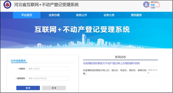 (1)用戶中心。登記人員反饋更(補(bǔ))信息后,申請人通過點(diǎn)擊系統(tǒng)右上角【用戶中心】下方的用戶姓名,進(jìn)入用戶中心。