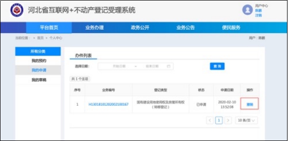 (2)撤銷申請材料及信息。通過點(diǎn)擊【我的申請】,選擇相應(yīng)申請事項(xiàng)進(jìn)行【撤銷】操作。