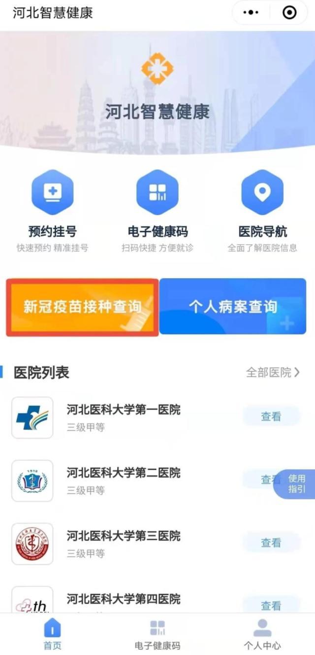 1.通過(guò)微信搜索小程序“河北智慧健康”,點(diǎn)擊“新冠疫苗接種查詢”,即可獲取個(gè)人接種記錄。
