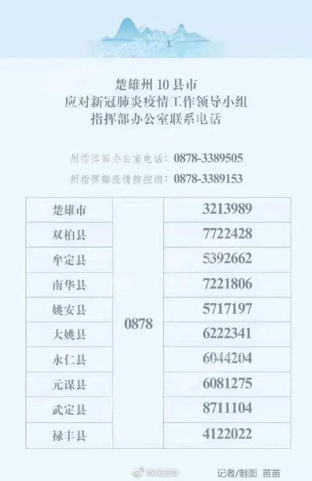 楚雄州應對疫情工作領導小組指揮部辦公室聯(lián)系電話:0878-3389505;