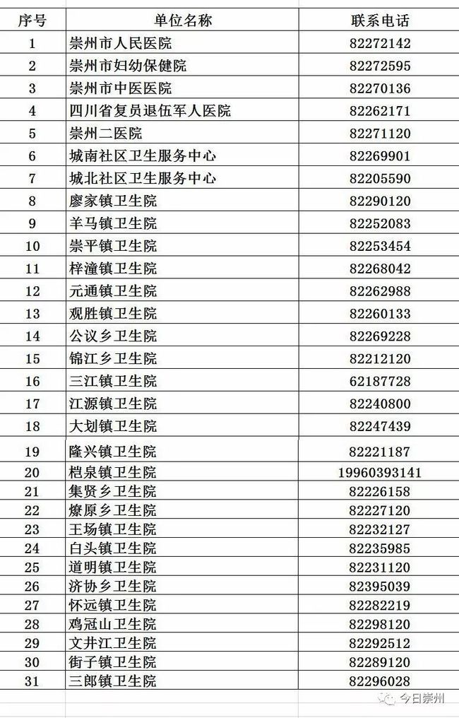 崇州全市5家醫(yī)院、24家衛(wèi)生院和2家衛(wèi)生服務(wù)中心聯(lián)系電話