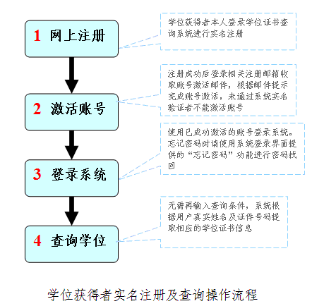 學(xué)位獲得者本人需閱讀并同意《學(xué)位證書查詢系統(tǒng)學(xué)位獲得者實(shí)名注冊(cè)條款》,并在使用過程中遵守本協(xié)議所述之條款,自行進(jìn)行實(shí)名注冊(cè),所注冊(cè)的個(gè)人信息必須真實(shí)、準(zhǔn)確。注冊(cè)成功后系統(tǒng)將進(jìn)行驗(yàn)證,并將驗(yàn)證結(jié)果發(fā)送至您注冊(cè)的電子郵箱,請(qǐng)登錄個(gè)人郵箱完成賬號(hào)激活操作,注冊(cè)后24小時(shí)不激活賬號(hào)者系統(tǒng)將自動(dòng)清除注冊(cè)的信息;注冊(cè)信息驗(yàn)證未通過的,請(qǐng)根據(jù)郵件提示進(jìn)行咨詢,系統(tǒng)將于注冊(cè)后2小時(shí)自動(dòng)清除驗(yàn)證未通過的注冊(cè)信息。
