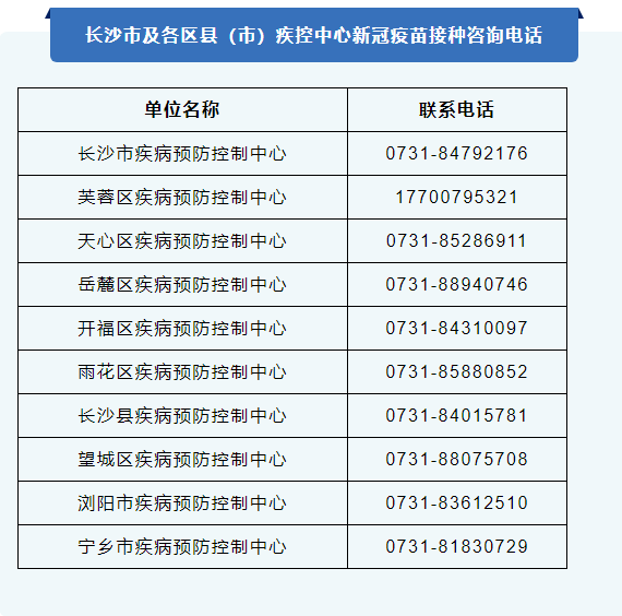4、長沙市及各區(qū)縣(市)疾病預(yù)防控制中心新冠病毒疫苗接種咨詢電話