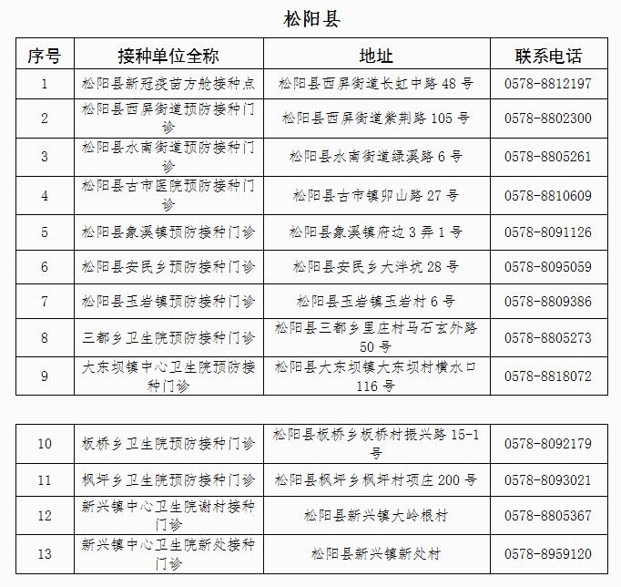 麗水市松陽縣新冠病毒疫苗接種點(diǎn)信息
