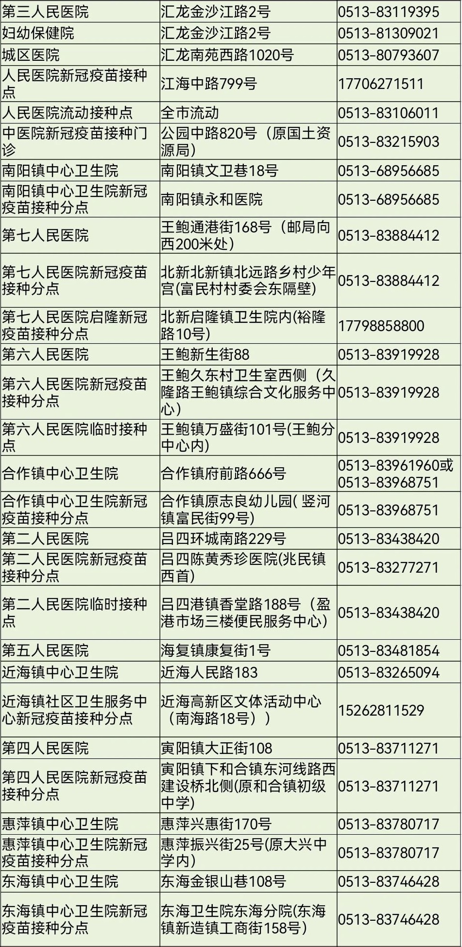 啟東市新冠病毒疫苗接種點信息