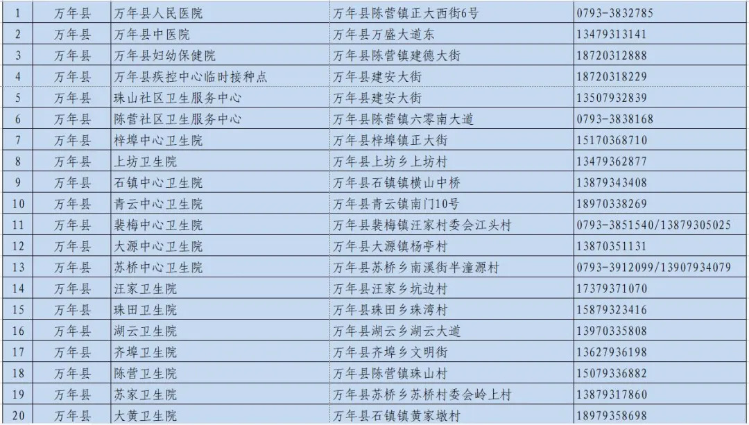 上饒市萬年縣新冠病毒疫苗接種點信息