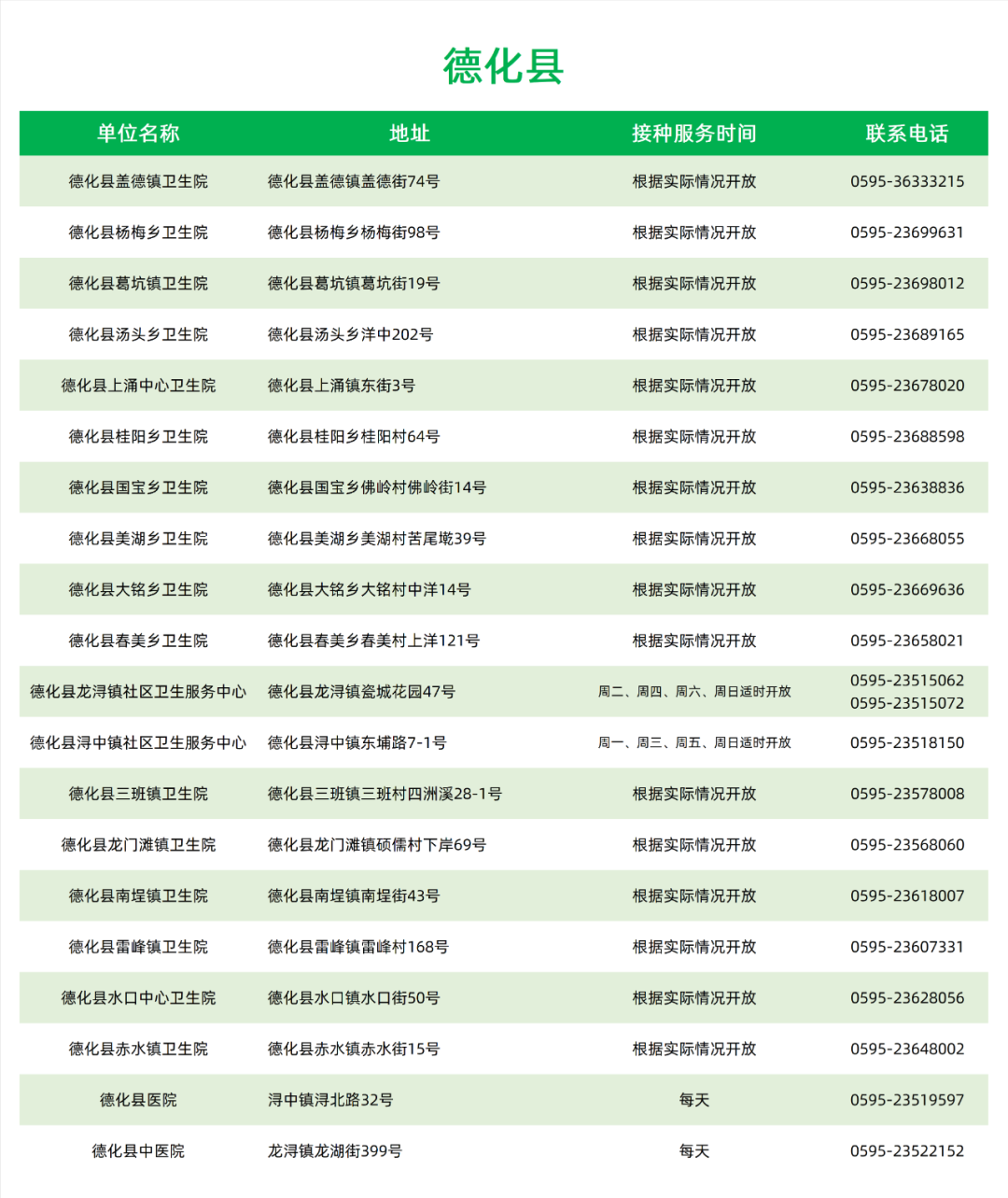 泉州市德化縣新冠病毒疫苗接種點(diǎn)信息