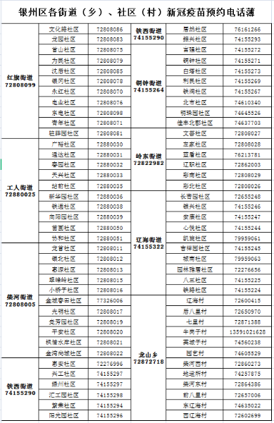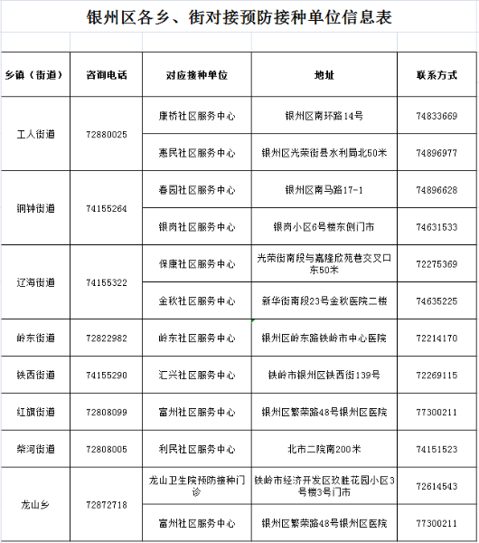即日起,鐵嶺市銀州區(qū)內(nèi)18歲以上居民(含60歲以上)不論戶籍,身體狀況符合接種要求的均需免費(fèi)接種新冠病毒疫苗,請(qǐng)您與所在單位或社區(qū)聯(lián)系疫苗接種相關(guān)事宜。零散居民、流動(dòng)人口也可攜帶身份證,就近自行前往接種點(diǎn)接種,接種點(diǎn)會(huì)根據(jù)疫苗供應(yīng)情況、日接種能力、排隊(duì)順序等發(fā)放接種序號(hào)。注意;接種點(diǎn)開放時(shí)間不定時(shí)有調(diào)整,建議先電話或者網(wǎng)上預(yù)約咨詢,鐵嶺市新冠疫情防控咨詢電話:024-74230306,銀州區(qū)新冠病毒疫情防控?zé)峋€電話:024-79090012;鐵嶺市銀州區(qū)新冠病毒疫苗接種單位名單、地址、接種時(shí)間和預(yù)約電話等相關(guān)信息請(qǐng)看這里↓↓↓